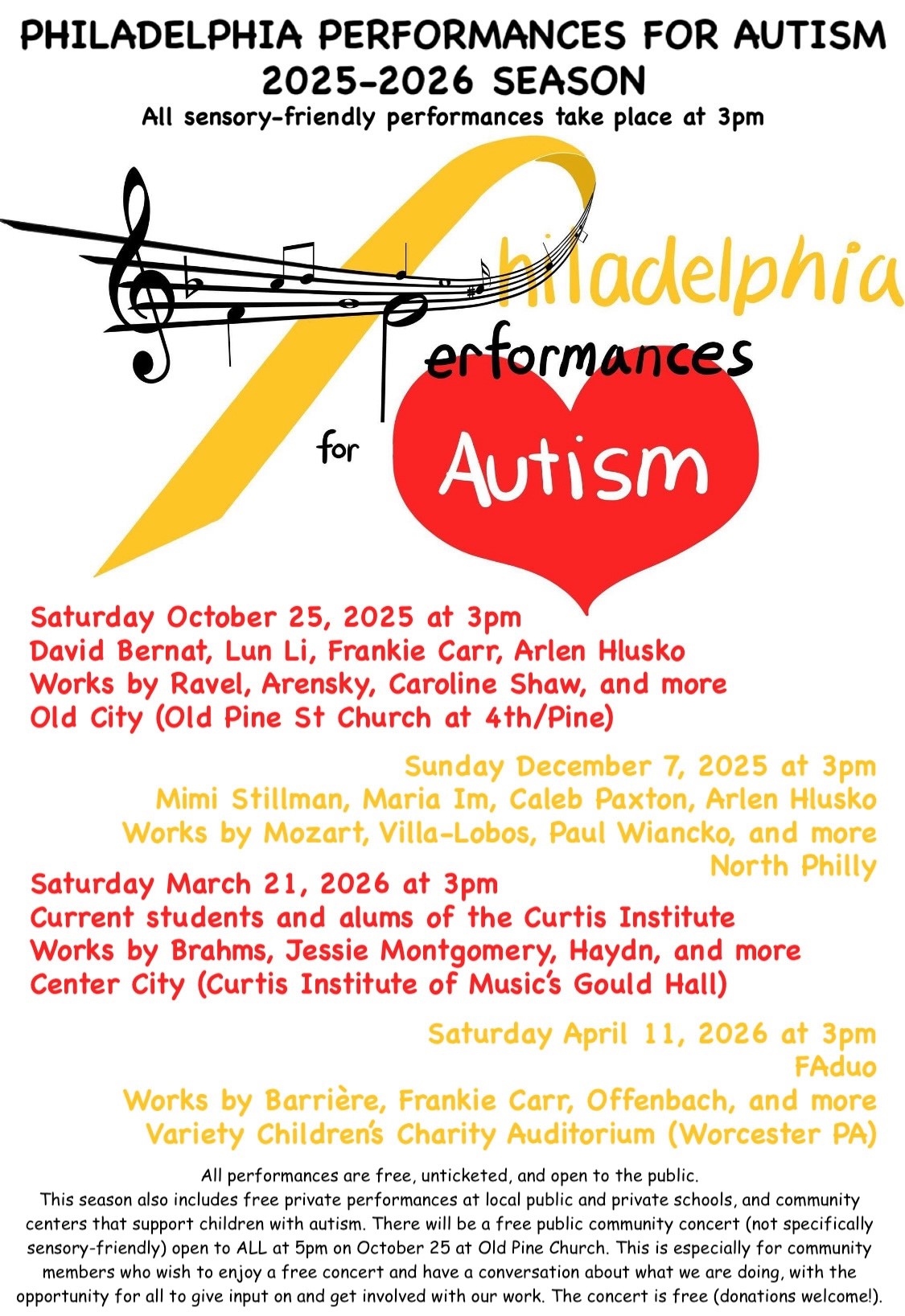 All performances are Free, un-ticketed, and open to the public. This season also includes free private performances at local public and private schools, and community centers that support children with autism. The concert is free (donations are welcome!).